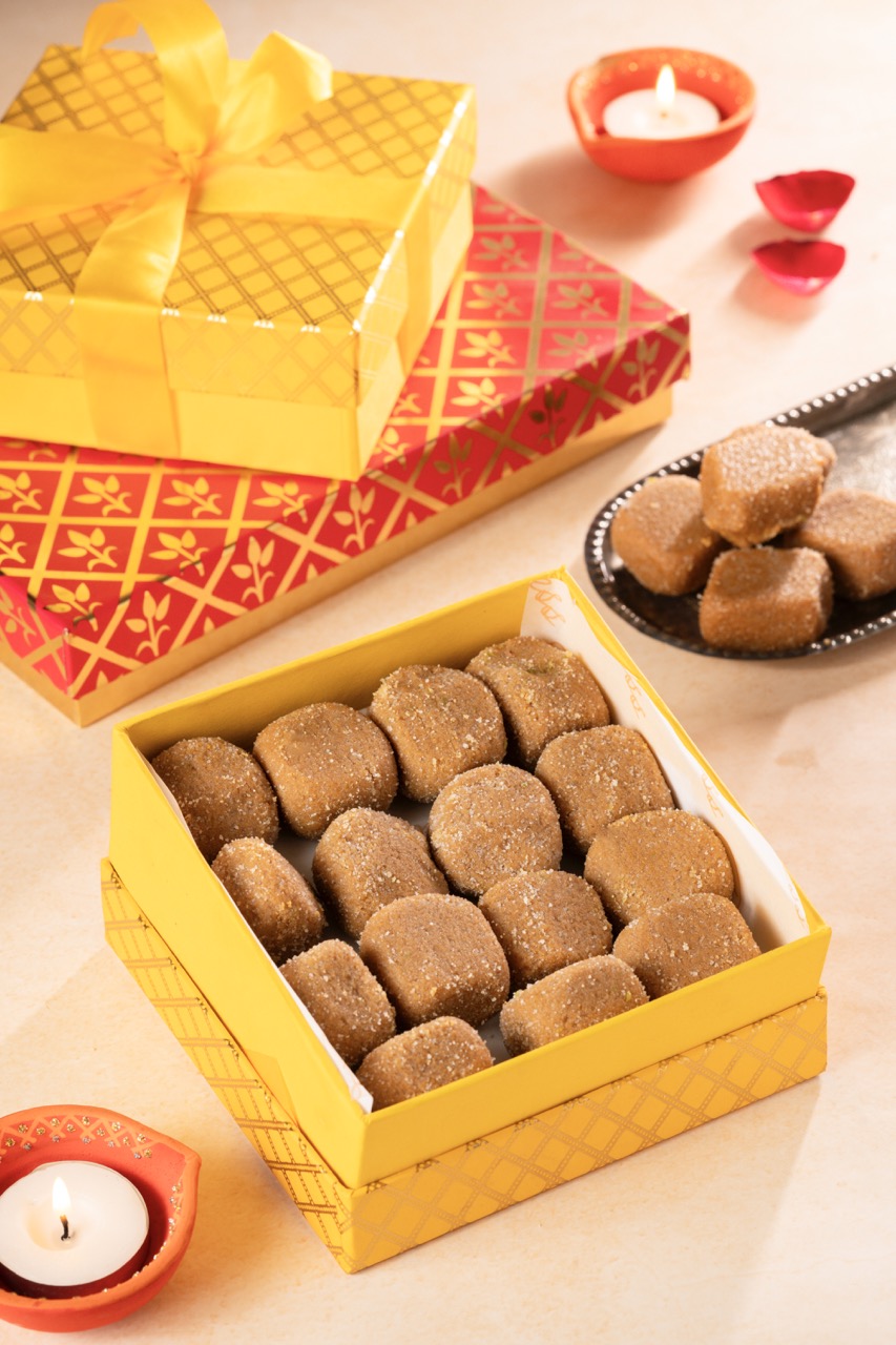 Our take on the traditional peda, made with pure mawa and sweetened with jaggery. Packed thoughtfully in a Diwali box and decorated with a ribbon.